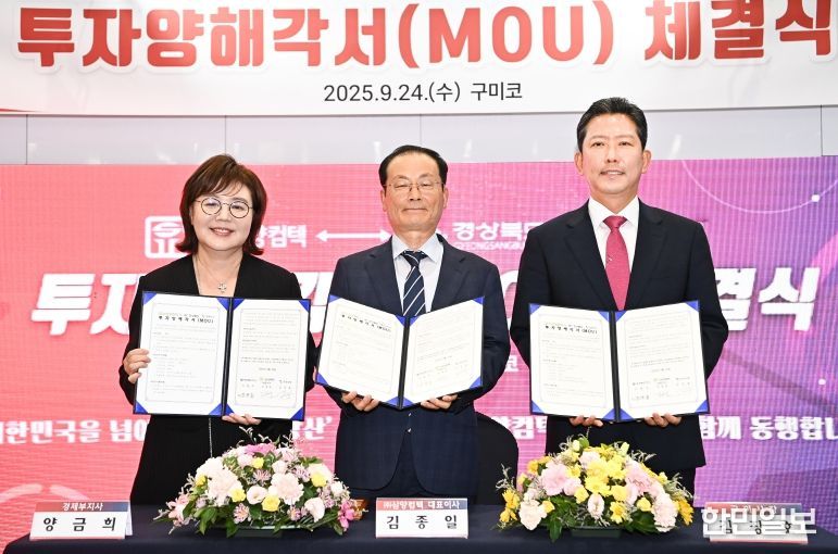한민일보 서울포커스 김봉순 기자 | 구미시는 9월 24일 구미코 경북라운지에서 2025 항공방위물류박람회(GADLEX) 개막 행사 전에 양금희 경상북도 경제부지사, 김장호 구미시장, 박교상 구미시의회 의장, 김종일 대표이사 등이 참석한 가운데 ㈜삼양컴텍와 경상북도·구미시 간 투자양해각서(MOU)를 체결했다.