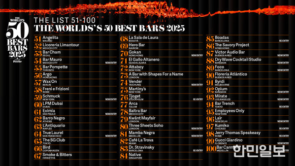 올해로 17회를 맞는 The World's 50 Best Bars 2025는 이번엔 홍콩에서 전 세계 음료인들이 모여 세계 최고의 칵테일을 선보일 예정이다. 50 Best는 51-100 명단을 통해 바와 칵테일 명소를 더욱 다양하게 조명하며 전 세계에 그 우수성을 널리 알리고 있다.
