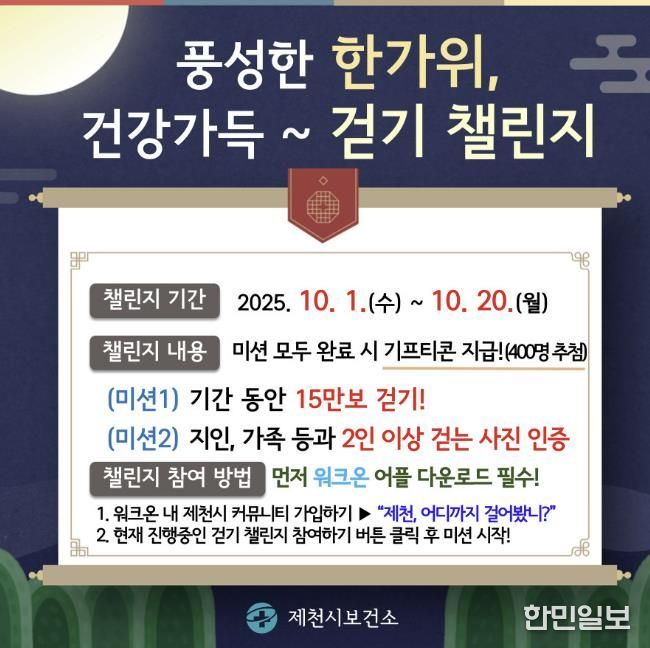 한민일보 서울포커스 김다남 기자 | 제천시보건소는 추석 연휴를 맞아 시민의 걷기 실천을 돕기 위해 ‘풍성한 한가위, 건강가득 걷기 챌린지’를 운영한다.