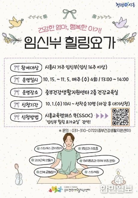 한민일보 서울포커스 유현민 기자 | 시흥시보건소 중부건강생활지원센터는 임신부의 신체적ㆍ정신적 건강 증진을 위해 오는 10월 15일부터 11월 5일까지 ‘임신부 힐링 요가교실’을 운영한다. 대상은 관내 임신 16주 이상 임신부로, 선착순 10명을 모집한다.