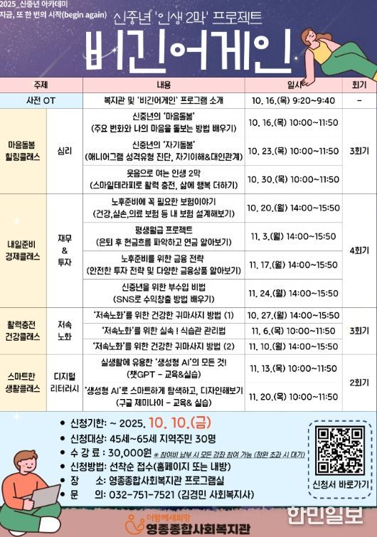 한민일보 서울포커스 김다남 기자 | 인천 중구 영종종합사회복지관은 오는 10월 16일부터 11월 24일까지 45세~65세 지역 주민을 대상으로 신중년 아카데미 ‘비긴어게인’을 운영한다고 밝혔다.