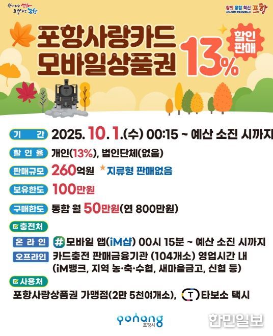 한민일보 서울포커스 임철현 기자 | 포항시는 추석 명절 지역경제 활력 제고를 위해 내달 1일부터 카드형·모바일 포항사랑상품권(이하 포항사랑카드)을 260억 원 규모로 13% 할인 판매한다.