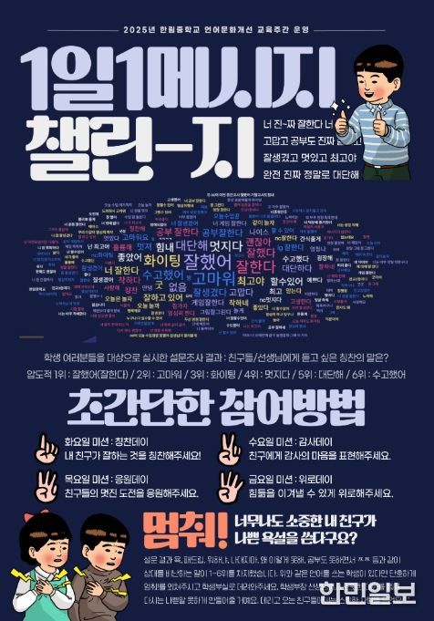 한편 한림중학교는 금요일까지 이어지는 프로그램을 통해 학생들이 자신의 언어 습관을 점검하고 바른 언어 사용이 학교 문화로 확고히 자리 잡을 수 있도록 지속적으로 노력할 계획이다.