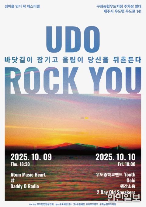 한민일보 서울포커스 김다남 기자 | 제주시 우도면은 오는 10월 9일과 10일 이틀간 농협우도지점 주차장 일대에서 인디 락 페스티벌 ‘U DO ROCK YOU 2025’를 개최한다.