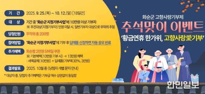 한민일보 서울포커스 박용남 기자 | 화순군은 민족 대명절 추석을 맞아 고향사랑기부제 감사 이벤트인 ‘황금연휴 한가위, 고향사랑愛기부’를 오는 9월 25일부터 10월 12일까지(18일간) 진행한다고 밝혔다.