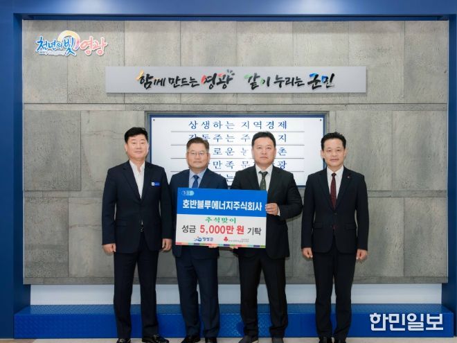 한민일보 서울포커스 박용남 기자 | 영광군은은 지난 24일 호반블루에너지(주)(대표 류병욱, 정맹화)에서 추석 명절을 맞아 저소득층의 따뜻한 명절 나기를 지원하기 위해 현금 5,000만 원을 기탁하여 전남사회복지공동모금회(회장 노동일)와 함께 기탁식을 가졌다고 밝혔다.