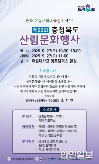 한민일보 서울포커스 임경복 기자 | 충북도는 오는 27일 영동군 유원대학교에서 임업인, 산림 관련 기관단체, 일반인들을 대상으로 ‘충청북도 산림문화행사’를 개최한다고 밝혔다.