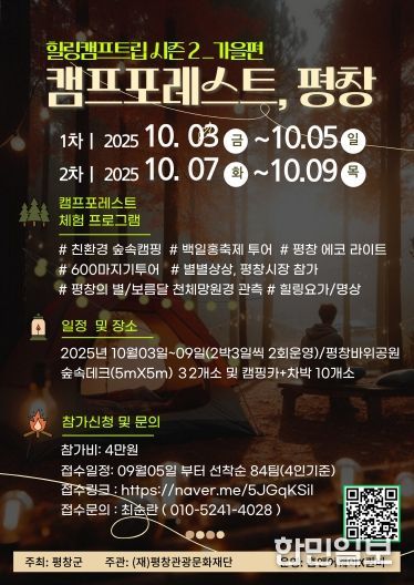 한민일보 서울포커스 진광성 기자 | 평창관광문화재단은 바위공원 힐링 프로그램 운영 사업을 통해 가을철 자연 속 힐링과 체험을 결합한 가족 단위 캠프 프로그램, '캠프포레스트, 평창'의 참가자를 모집한다. 행사는 오는 10월 3일부터 9일까지 평창군 평창읍 바위공원 일대에서 진행된다.
