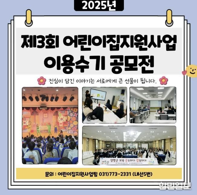 조연경 센터장은 “이번 이용수기 공모전은 센터를 이용한 가족과 어린이집 보육교직원들의 소중한 경험을 공유하는 뜻깊은 자리가 될 것”이라며, “앞으로도 양평군 특성에 맞춘 맞춤형 육아지원 사업을 지속적으로 추진해 나가겠다”고 전했다.