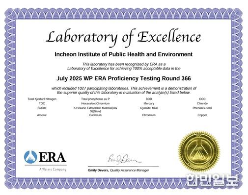 한민일보 서울포커스 유창렬 기자 | 인천광역시 보건환경연구원은 미국 환경자원협회(ERA)가 주관한 2025년 환경분야 국제숙련도 평가에서 ‘최우수 등급(Laboratory of Excellence)’을 받았다고 밝혔다.