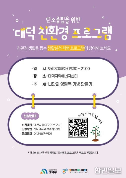 한민일보 서울포커스 진광성 기자 | 대전 대덕구는 구민이 일상에서 친환경 실천을 경험할 수 있도록 ‘대덕 친환경 프로그램’을 오는 11월까지 매월 운영한다고 밝혔다.