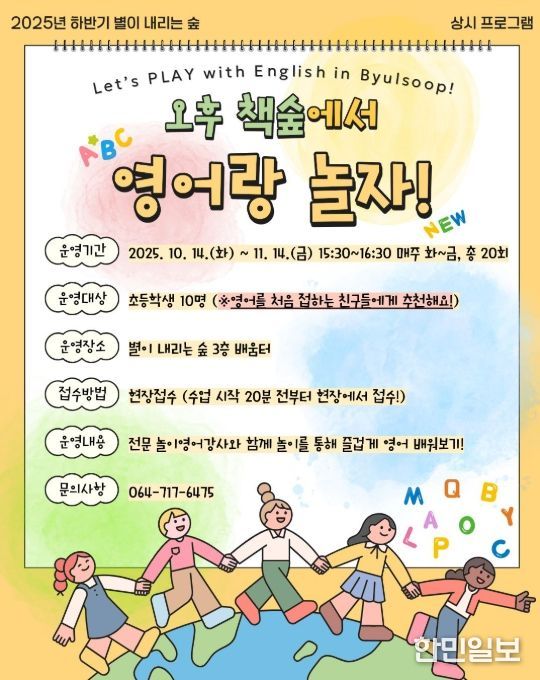 한민일보 서울포커스 임철현 기자 | 제주도교육청 제주도서관은 10월 14일부터 오는 11월 14일까지 한 달간 ‘별이 내리는 숲’ 3층 배움터에서 초등학생 10명을 대상으로 놀이 중심 영어 교육 프로그램 ‘오후 책숲에서 영어랑 놀자!’를 총 20회 운영한다.