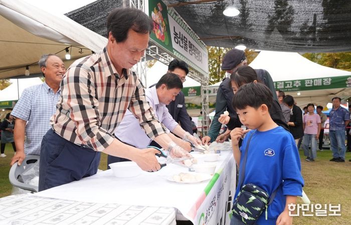 셋째 날인 27일, 금빛근린공원 내 명작장터는 오전부터 열린 농산물 시식 행사에 방문객들이 가득 찼다.