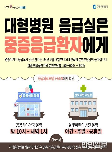 한민일보 서울포커스 유창렬 기자 | 인천광역시는 추석 연휴를 맞아 의료공백을 최소화하고 응급 상황에 신속히 대응하기 위해 시 및 군·구 보건소에 응급진료상황실을 운영하고, 응급의료기관·병의원·약국 등을 중심으로 비상 진료체계를 본격 가동한다고 밝혔다.
