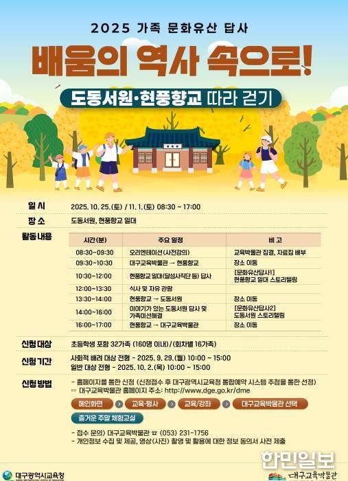 한민일보 서울포커스 임철현 기자 | 대구교육박물관은 오는 10월 25일과 11월 1일, 두 차례에 걸쳐 초등학생 가족들을 대상으로 ‘배움의 역사 속으로! 도동서원·현풍향교 따라 걷기’가족문화유산답사 프로그램을 운영한다.