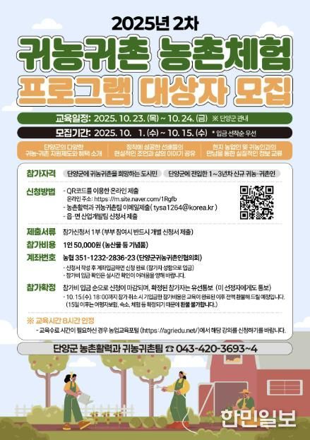 한민일보 서울포커스 김다남 기자 | 충북 단양군은 농촌의 매력을 직접 느끼고 귀농·귀촌 정보를 배울 수 있는 ‘귀농귀촌 농촌체험 프로그램’ 참가자를 모집한다고 30일 밝혔다.