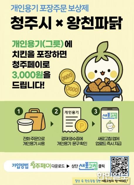한민일보 서울포커스 김다남 기자 | 청주시는 10월 1일부터 ‘새로고침’ 모바일앱을 통해 전국 최초 개인용기 포장주문 보상제를 시행한다. 참여자에게는 지역화폐인 청주사랑상품권(청주페이) 3천원이 보상으로 지급된다.