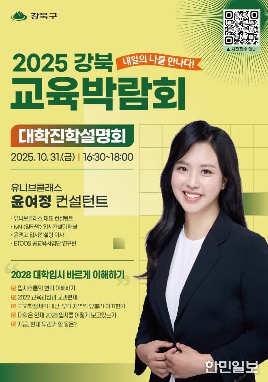 한민일보 서울포커스 김봉순 기자 | 강북구는 오는 10월 31일 '2025 강북 교육박람회'의 일환으로 열리는 ‘2028 대학입시 바르게 이해하기’ 설명회 참석자를 10월 10일부터 모집한다.
