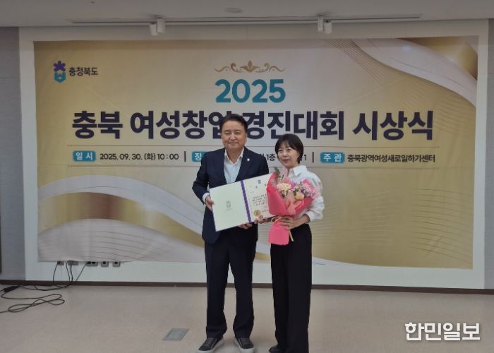 한민일보 서울포커스 김다남 기자 | 지난 9월 30일 충청북도의회 워크숍실에서 열린 ‘2025 충북 여성창업 경진대회’에서 제천여성새로일하기센터 지연옥씨(바닐라유닛/사용자 프로파일 기반 AI 지역정보 추천 플랫폼 ‘오늘의 제천’)가 우수상을 받았다.