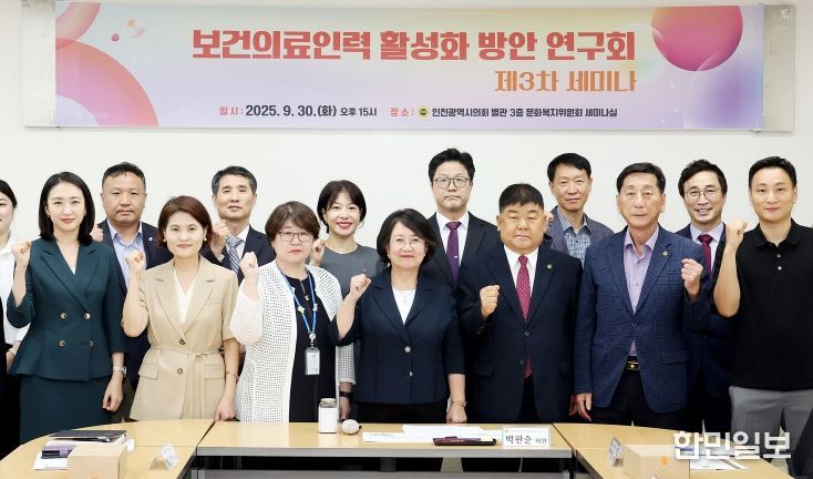 한민일보 서울포커스 유창렬 기자 | 인천광역시의회 의원연구단체인 ‘보건의료인력 활성화 방안 연구회’는 30일 문화복지위원회 세미나실에서 박판순 대표의원(국·비례)을 비롯해 박창호(국·비례)·이봉락(국·미추홀구3) 의원, ‘의료기사단체 정책연구단’관계자 등이 참석한 가운데 ‘제3차 정책 세미나’를 개최했다.