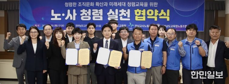 한민일보 서울포커스 임철현 기자 | 전라남도교육청은 30일 청사 비즈니스실에서 전남교사노동조합, 전라남도교육청노동조합과 ‘청렴 실천 협약(MOU)’을 맺고 청렴한 조직문화 확산과 미래세대 청렴교육 강화를 약속했다.