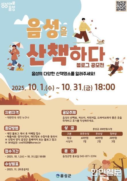 한민일보 서울포커스 김다남 기자 | 음성군이 지역 곳곳의 아름다운 산책 명소의 매력을 알리기 위해 지난 1일부터 이달 31일까지 ‘2025년 음성군 블로그 공모전’을 개최한다.