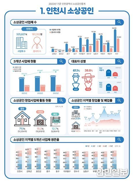 소상공인 통계는 2023년 12월 31일 기준으로 인천시 관내 소상공인의 사업체 규모, 매출, 고용, 업종별 현황 등을 종합적으로 분석한 지역통계다.