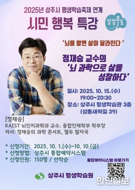 한민일보 서울포커스 김봉순 기자 | 상주시 평생학습원은 2025. 10. 15. 오후 7시부터 8시30분까지 상주시 평생학습관 3층 강당에서 뇌과학자이자 미래학자인 정재승 KAIST 교수를 초청하여 특별 강연을 진행한다.