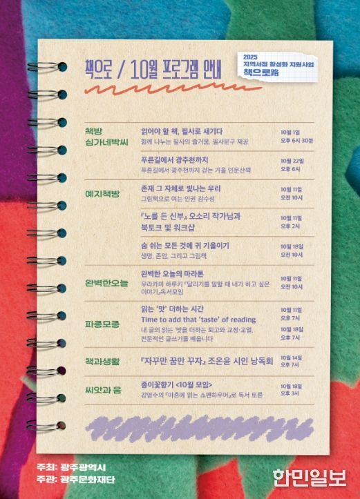 한민일보 서울포커스 박용남 기자 | 광주문화재단이 추진 중인 ‘2025 지역서점 활성화 지원사업 - 책으로(路)’가 독서의 계절 10월을 맞아 한층 다채로운 프로그램으로 시민들을 찾아간다.