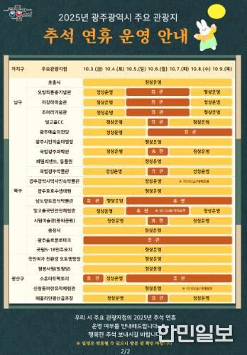이승규 신활력추진본부장은 “광주에는 북적이는 관광지가 아니더라도 조용하고 매력적인 숨은 명소가 많다”며 “추석 연휴 시민과 관광객들이 광주의 가을 정취 속에서 여유롭고 풍성한 명절을 보내시길 바란다”고 말했다.