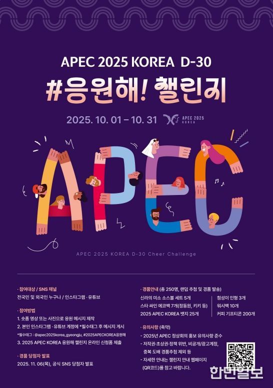 한민일보 서울포커스 김은금 기자 | 경상북도는 2025년 APEC 정상회의 성공개최를 위해 10월 1일부터 한 달간 전 국민 응원 캠페인 ‘#응원해! 챌린지’를 진행한다고 밝혔다.