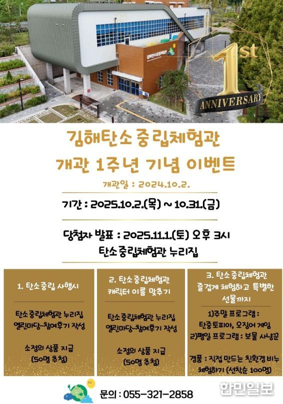한민일보 서울포커스 김은금 기자 | 김해시는 김해탄소중립체험관 개관 1주년을 맞아 2일부터 31일까지 한 달간 특별 기념 이벤트를 운영한다. 이번 이벤트는 온라인과 오프라인 어디든 자유롭게 참여할 수 있다.