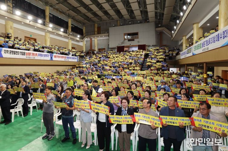 한민일보 서울포커스 박용남 기자 | 무주군이 지난 1일 무주예체문화관 대강당에서 농어촌 기본소득 시범사업 선정을 촉구하는 범군민 결의대회를 개최했다.