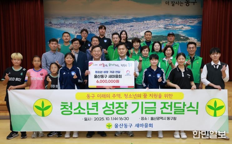 한민일보 서울포커스 기자 | 울산 동구 새마을회는 10월 1일 오후 4시 30분 울산 동구청에서 김종훈 동구청장과 학교 관계자가 참석한 가운데 청소년 성장 기금 전달식을 가졌다.