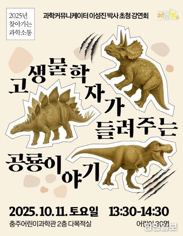 한민일보 서울포커스 김다남 기자 | 충주어린이과학관은 오는 10월 11일, 과학커뮤니케이터로 활동 중인 고생물학자 이성진 박사를 초청해 초등 저학년 어린이를 위한 특별 강연 ‘고생물학자가 들려주는 공룡 이야기’를 개최한다고 밝혔다.