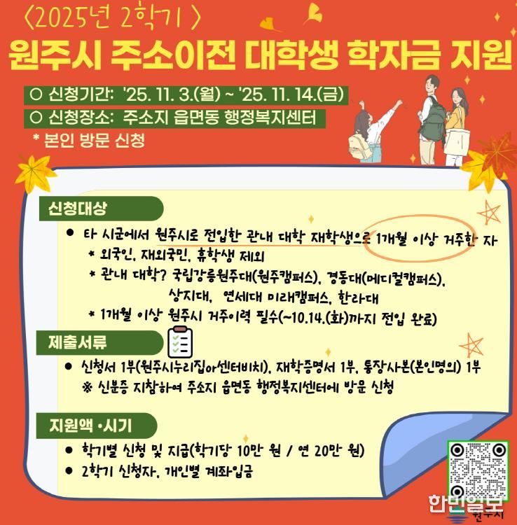 한민일보 서울포커스 임경복 기자 | 원주시는 전입신고를 마치고 원주시민이 된 관내 대학생에게 상·하반기 각 10만 원씩 연 20만 원의 학자금을 지원하고 있다.