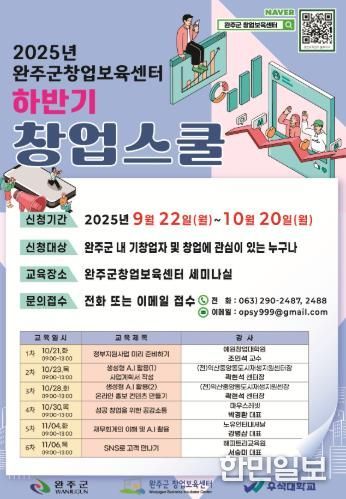 모집 기간은 20일까지이며, 완주군 창업보육센터에 전화 또는 이메일을 통해 신청이 가능하다.