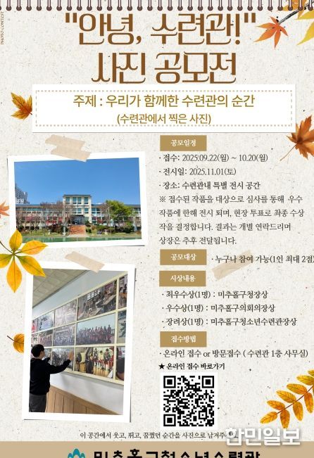 한민일보 서울포커스 백진욱 기자 | 인천 미추홀구청소년수련관은 수련관 이전을 앞두고 지난 30여 년간의 추억을 함께 기록하기 위해 ‘안녕, 수련관’ 사진 공모전을 진행하고 있다고 2일 밝혔다.