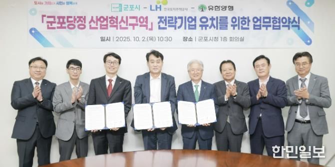 한민일보 서울포커스 임경복 기자 | 군포시는 2일 군포시청에서 한국토지주택공사(LH), ㈜유한양행과 ‘군포당정 산업혁신구역’ R·D 전략기업 유치를 위한 업무협약을 체결했다고 밝혔다.