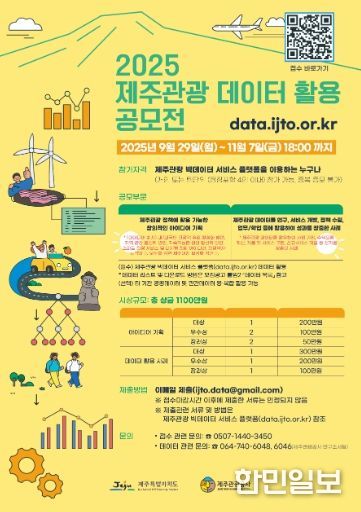 한민일보 서울포커스 유한희 기자 | 제주특별자치도와 제주관광공사는 오는 11월 7일까지 온라인 채널을 통해 ‘2025년 제주관광 데이터 활용 공모전’ 참가자를 모집하고 있다고 2일 밝혔다.