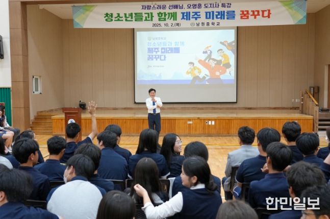 한민일보 서울포커스 임철현 기자 | 오영훈 제주특별자치도지사는 2일 남원중학교(교장 오경석)를 찾아 전교생을 대상으로 특별강연을 열고, “남원과 제주를 넘어 아시아, 나아가 우주까지 여러분의 무대가 돼야 한다”며 청소년들의 꿈과 도전을 격려했다.