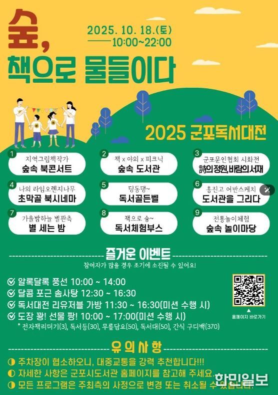 하은호 군포시장은 “올해 독서의 달 행사는 책 읽는 즐거움을 넘어 예술과 체험이 어우러진 복합 문화축제로 시민들과 함께 했다”며 “오는 10월 17~18일 군포올래 행복축제 기간에 초막골 생태공원에서 열리는 군포독서대전에서도 시민들이 책과 가까워지고 다양한 독서문화 프로그램을 즐길 수 있도록 풍성한 행사를 준비하고 있다”며 많은 관심과 참여를 당부했다.