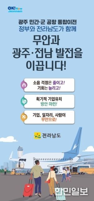 한민일보 서울포커스 박정민 기자 | 전라남도는 전남·광주·무안의 상생과 도민의 오랜 염원을 이루기 위해 광주 민간·군 공항의 무안국제공항 통합이전을 ‘더 이상 미룰 수 없는 시대적 과제’로 규정하고 강력히 추진할 계획이라고 밝혔다.