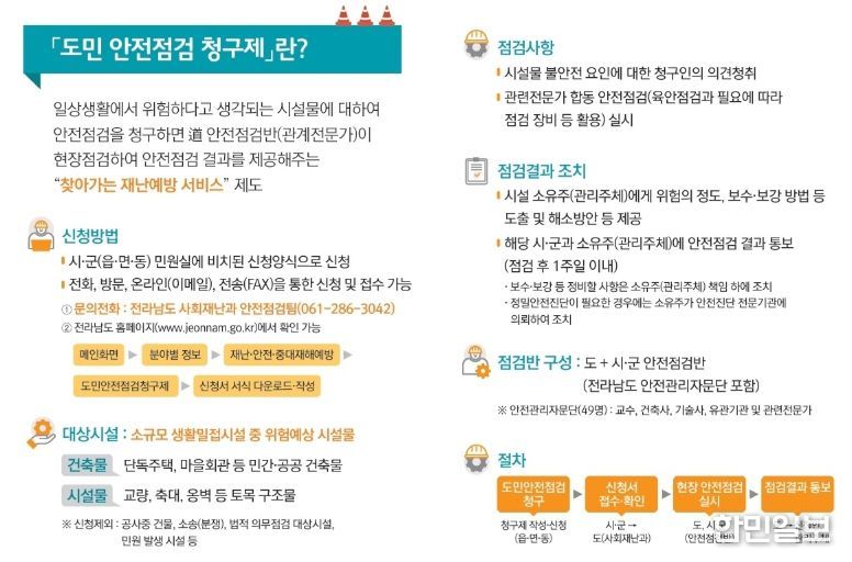 한민일보 서울포커스 박정민 기자 | 전라남도는 각종 재난으로부터 도민의 생명과 재산을 보호하고 일상 생활주변에 불안전한 위험요소를 찾아 무료로 안전점검하는 ‘도민 안전점검 청구제’를 운영하고 있다고 밝혔다.