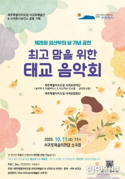 한민일보 서울포커스 김다남 기자 | 서귀포시는 오는 10월 11일 11시 서귀포예술의전당 소극장에서 제주특별자치도립 서귀포예술단과 서귀포보건소가 공동으로 주관하는 제20회 임산부의 날 기념 공연 '최고 맘을 위한 태교음악회'를 개최한다.