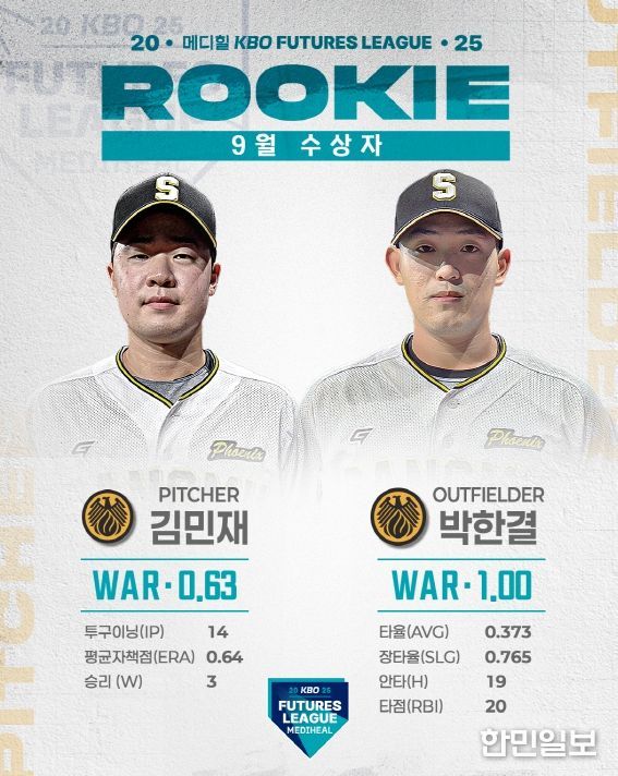 한민일보 서울포커스 최성훈 기자 | 2025 메디힐 KBO 퓨처스리그의 9월 퓨처스 루키상 수상자로 투수 부문에는 상무 김민재가 WAR 0.63, 타자 부문에는 상무 박한결이 WAR 1.00을 기록하며 각각 선정됐다.