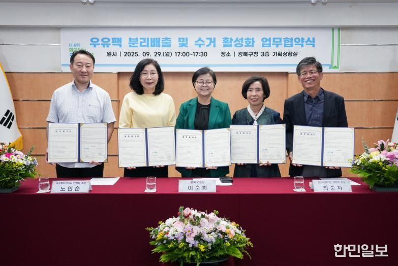 한민일보 서울포커스 김봉순 기자 | 서울 강북구는 9월 29일(월) 구청 기획상황실에서 강북구어린이집연합회와 어진이마을관리 사회적협동조합과 함께 우유팩 분리배출 및 수거 활성화 기반 구축을 위한 업무협약을 체결했다고 밝혔다.