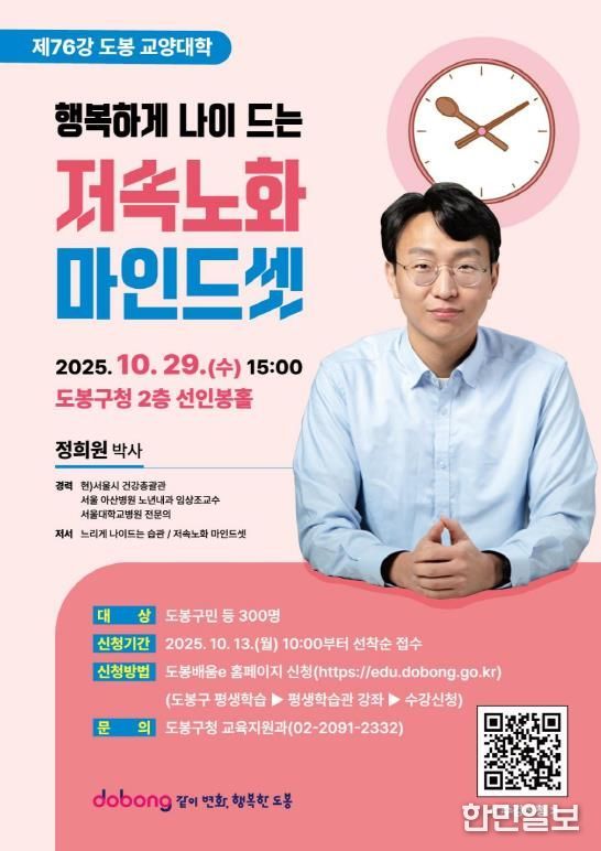 한민일보 서울포커스 김봉순 기자 | 서울 도봉구가 10월 13일 오전 10시부터 ‘저속노화 마인드셋’ 특강 참여자를 모집한다.