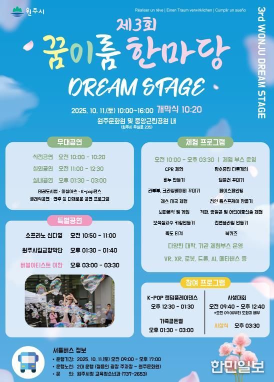 한민일보 서울포커스 임경복 기자 | 원주시는 오는 11일 원주문화원 및 중앙근린공원 일원에서 ‘제3회 원주시 꿈이룸 한마당’을 개최한다.