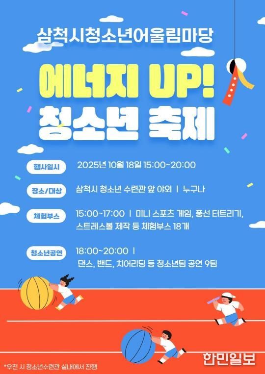 한민일보 서울포커스 임경복 기자 | 삼척시청소년수련관은 오는 10월 18일 오후 3시부터 관내 청소년과 가족을 대상으로 2025 삼척시청소년어울림마당 『에너지 UP! 청소년축제』를 개최한다.